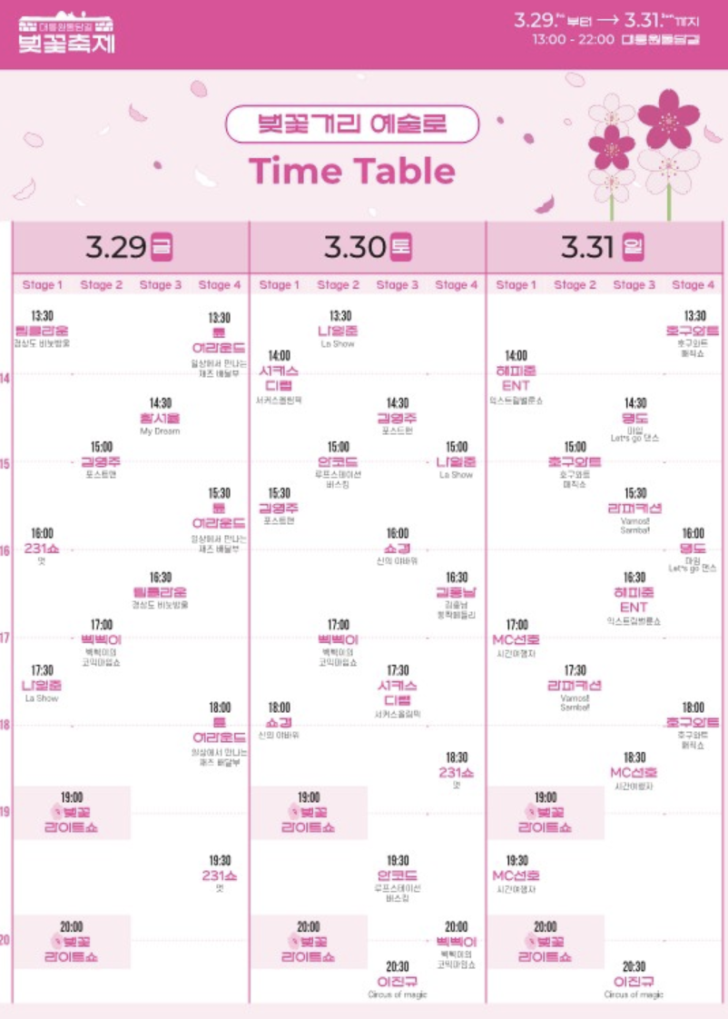 아래는 3일간 열리는 일정과 배치도입니다. 시간에 맞게 참석하여 공연을 즐기시길 바라겠습니다.