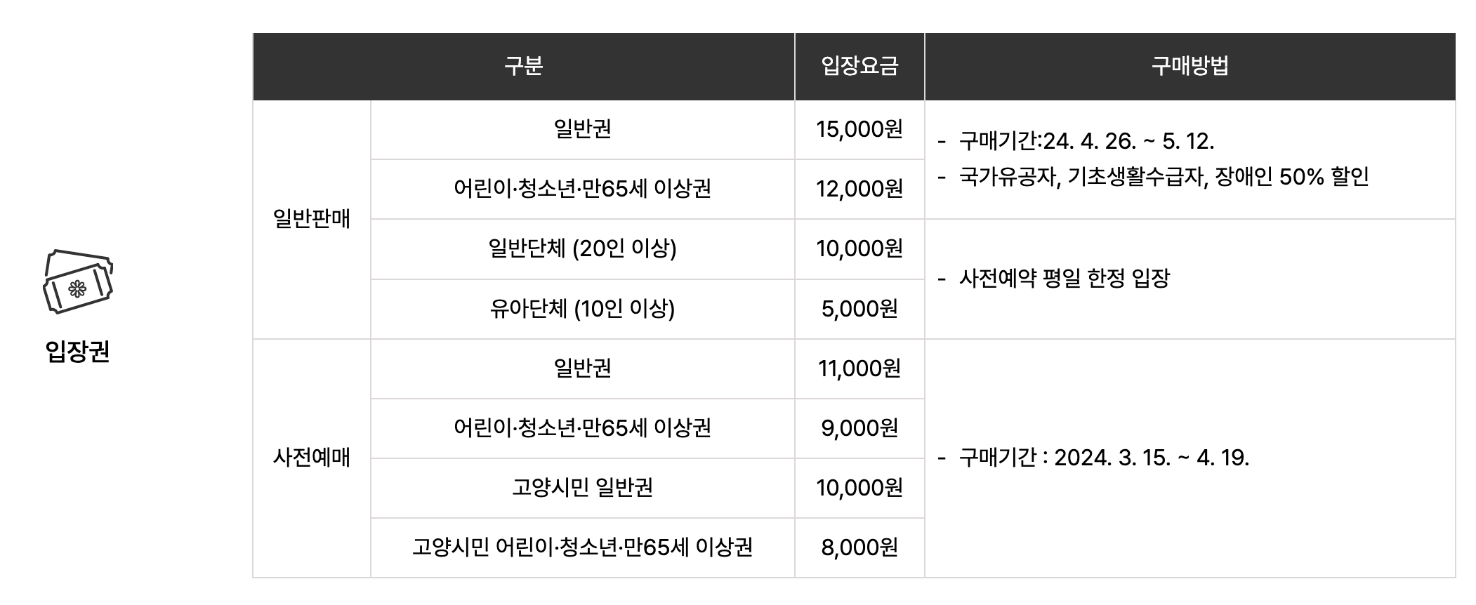 사전예매는 3월 15일부터 4월 19일까지 진행되며, 현장 매표는 4월 26일부터 5월 12일까지 이루어집니다. 사전예매는 할인 혜택이 있으므로, 방문을 계획 중이시라면 미리 예매하는 것이 좋습니다.