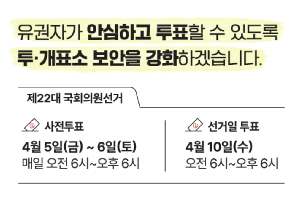사전투표 기간은 4월 5일(금)부터 4월 6일(토)까지이며, 매일 오전 6시부터 오후 6시까지 투표가 가능합니다. 사전투표소는 전국에 설치되어 있으며, 선거권은 선거일 현재 18세 이상의 국민에게 부여됩니다(2006.4.11.에 태어난 사람까지 포함)