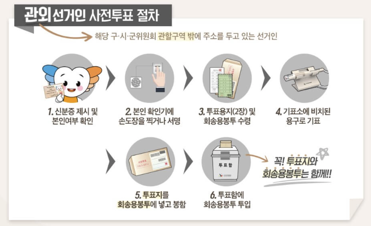 사전투표는 선거인이 별도의 신고 없이 사전투표기간에 읍·면·동마다 설치되는 사전투표소에 가서 투표할 수 있는 편리한 제도입니다.